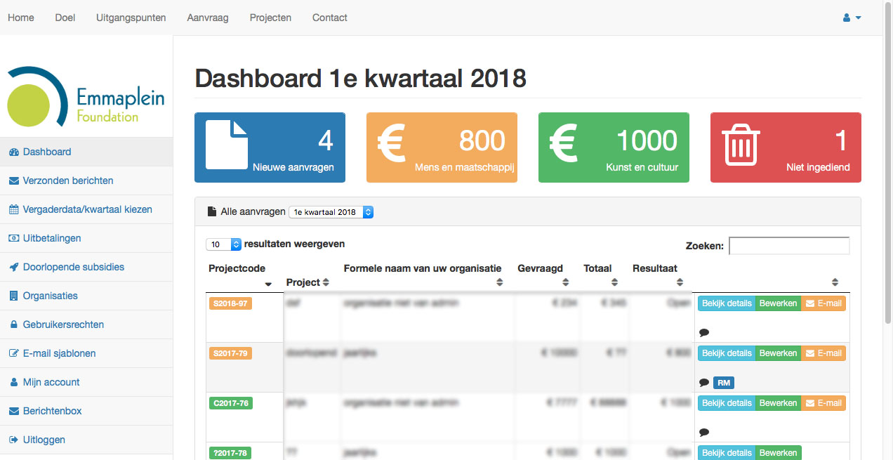 De Emmaplein Foundation is gevestigd in Haren. Deze stichting beheert ruim vier miljoen euro en doet uitkeringen uit de opbrengsten van dit kapitaal. Voor Emmaplein Foundation is een op maat gemaakte webapplicatie ontwikkeld: een volledig digitaal aanvraagsysteem waarmee organisaties subsidie kunnen aanvragen. Via een uitgebreide backoffice beheert de stichting alle aanvragen per kwartaal, de uitbetalingen, vergaderingen, berichten en gebruikersrechten. Ook is er een dashboard dat meteen inzicht geeft in het aantal nieuwe aanvragen en de verdeling van de subsidies. De stijl is zakelijk en functioneel, met blauwgroene kleuren, en een overzichtelijke zijbalknavigatie. Er is een databel toegevoegd met sorteer- en zoekfunctionaliteit. Deze applicatie is gebouwd in SoloCMS met Symfony als fundament.