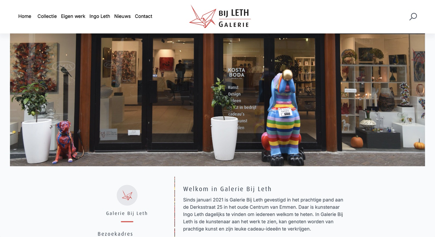 Galerie Bij Leth is gevestigd in het centrum van Emmen. In dit pand is kunstenaar Ingo Leth dagelijks te vinden en kunnen bezoekers genieten van een gevarieerde collectie kunst en design. De website straalt de rust en elegantie van de galerie uit: een full-width etalagefoto als hero, strakke witte vlakken en een verfijnd kleurpalet met rood als accent. Het handgevouwen kraanvogel-logo zorgt voor een persoonlijk karakter. De site is gebouwd in SoloCMS, met een galerijmodule voor de collectiepresentatie en een nieuwssectie voor evenementen.